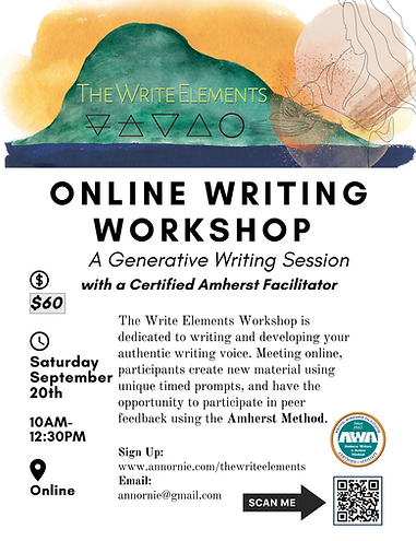 📖The Write Elements Online Writing Workshop offers a safe place to create new material. Utilizing unique writing prompts, supplied by the facilitator, you can finish the workshop with up to three new pieces of writing.